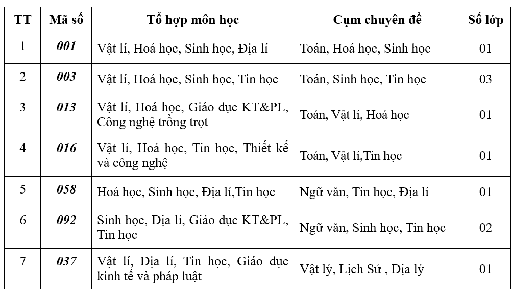 4. Thời gian học sinh nhận giấy báo dự thi: ngày 31/5/2024. - Buổi sáng: Từ 7h30’ đến 11h00’ - Buổi chiều: Từ 13h30’ đến 16h30’ II. PHƯƠNG ÁN TỔ CHỨC LỚP HỌC 1. Học sinh trúng tuyển vào lớp 10 trường THPT Nguyễn Việt Hồng năm học 2024-2025 sẽ được học các môn bắt buộc: Toán, Ngữ văn, Ngoại ngữ 1 (tiếng Anh), Lịch sử, Giáo dục thể chất, Giáo dục quốc phòng an ninh, nội dung giáo dục địa phương và tham gia các hoạt động giáo dục bắt buộc là hoạt động trải nghiệm - hướng nghiệp. 2. Đối với các nhóm môn học lựa chọn và các chuyên đề học tập lựa chọn, học sinh sẽ được nhà trường tổ chức cho chọn lựa theo các lớp với các tổ hợp môn học như sau:Dự kiến có 07 nhóm tổ hợp môn học.