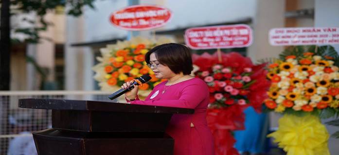 Bà Trần Hồng Thắm - đại diện Thành ủy đọc thư chúc mừng năm học mới.